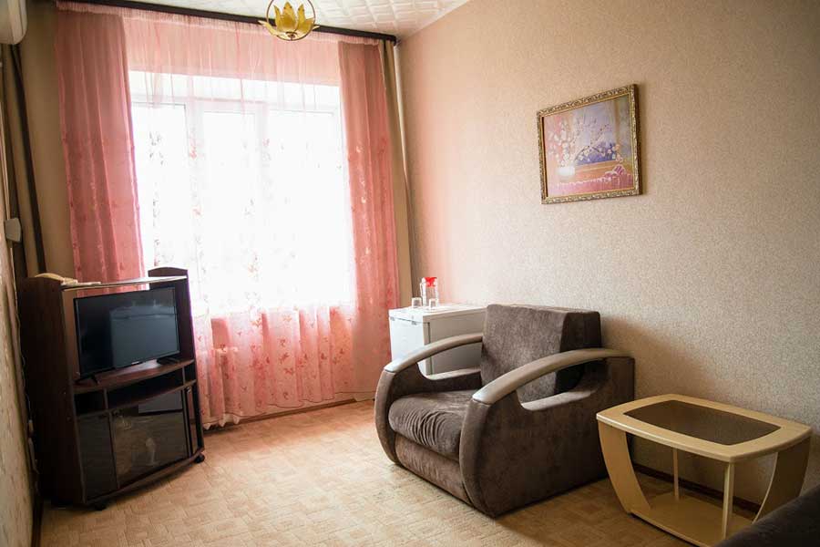 Двухкомнатный номер для комфортного размещения до 3 человек. В комнате размещена двуспальная кровать, в гостиной удобный диван.